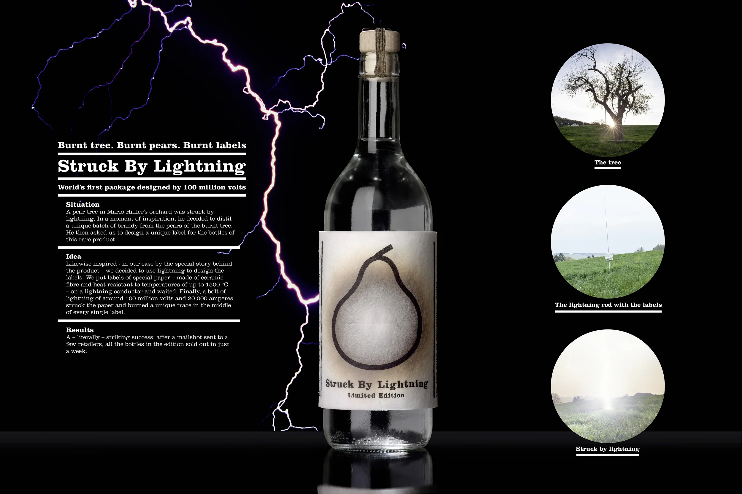Für eine Destillerie designten wir ein Label für einen speziellen Obstbrand. Mit einem echten Blitz.
