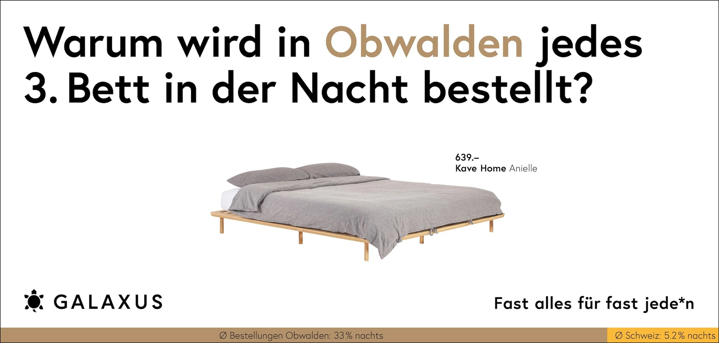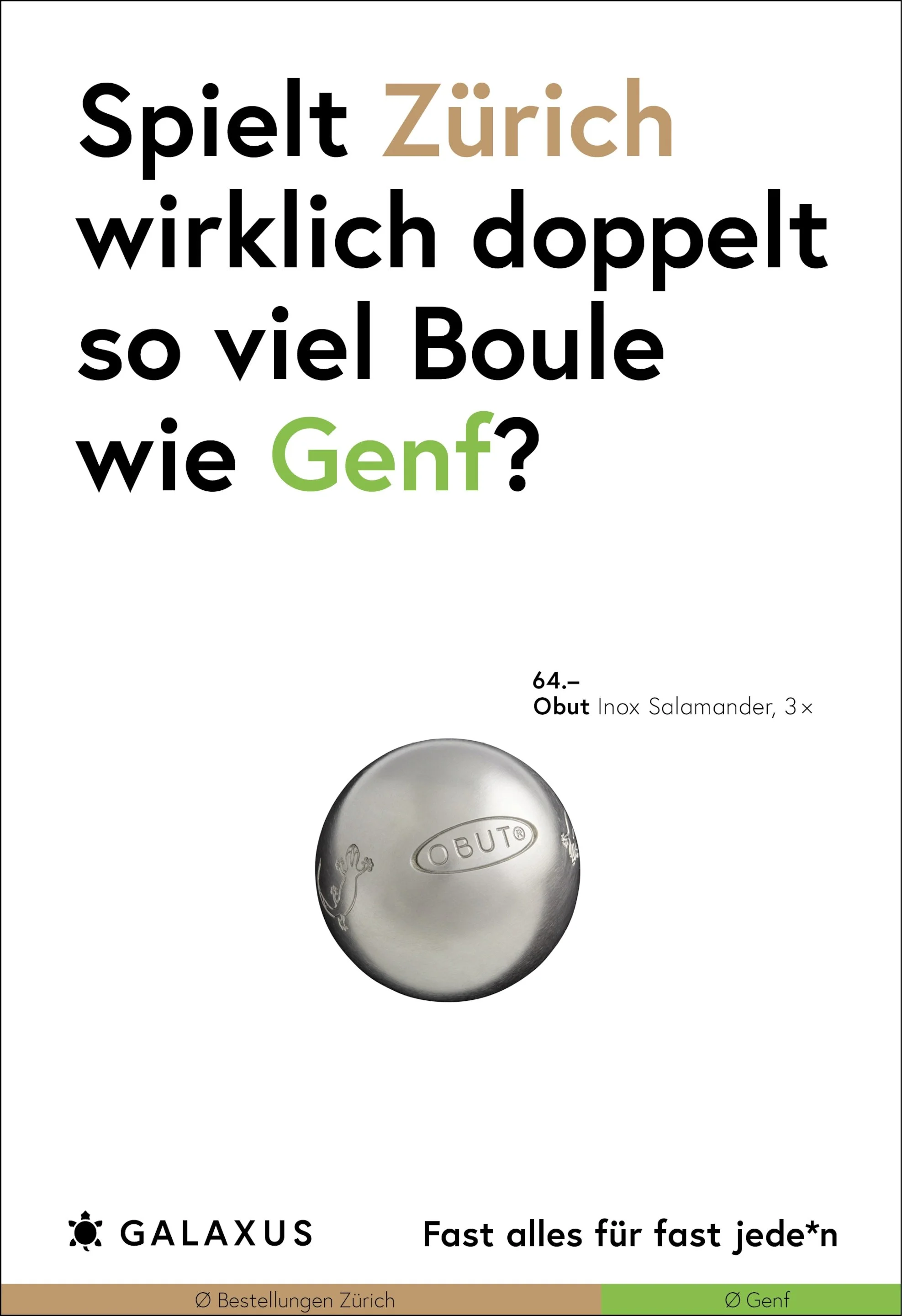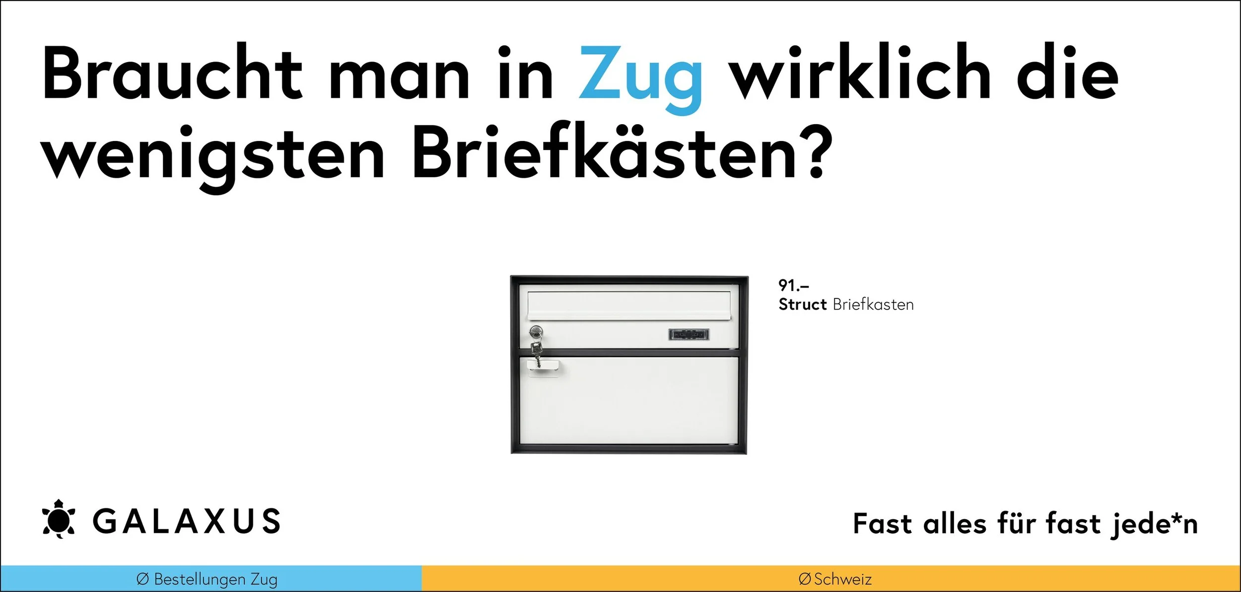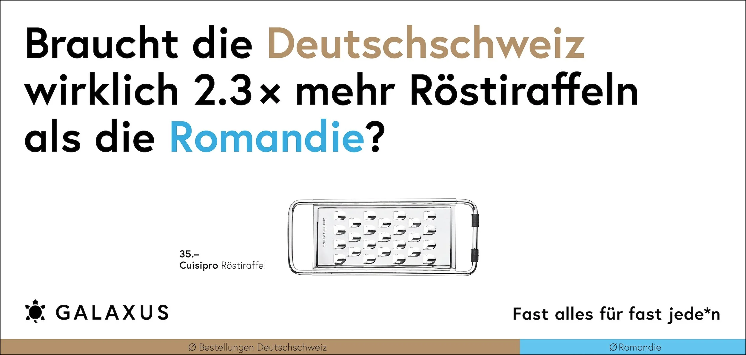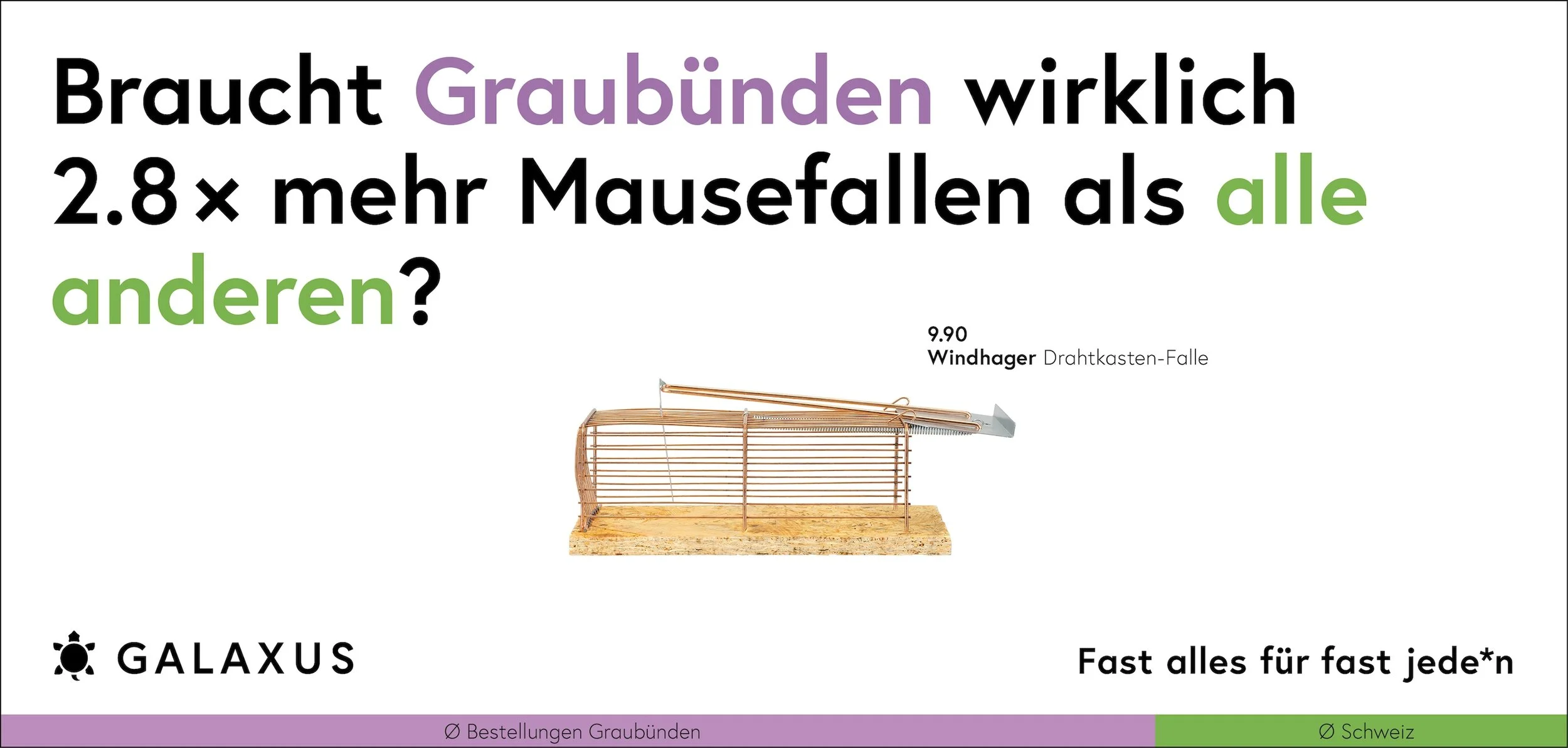 Die halbe Schweiz kauft bei Galaxus. Da denkt man, dass sich ihr Kaufverhalten nicht gross unterscheidet. Doch unsere Plakate warfen Fragen auf. Denn was wie ein Witz klingt, war bis auf den Dezimalpunkt genau das, was die Daten sagten.